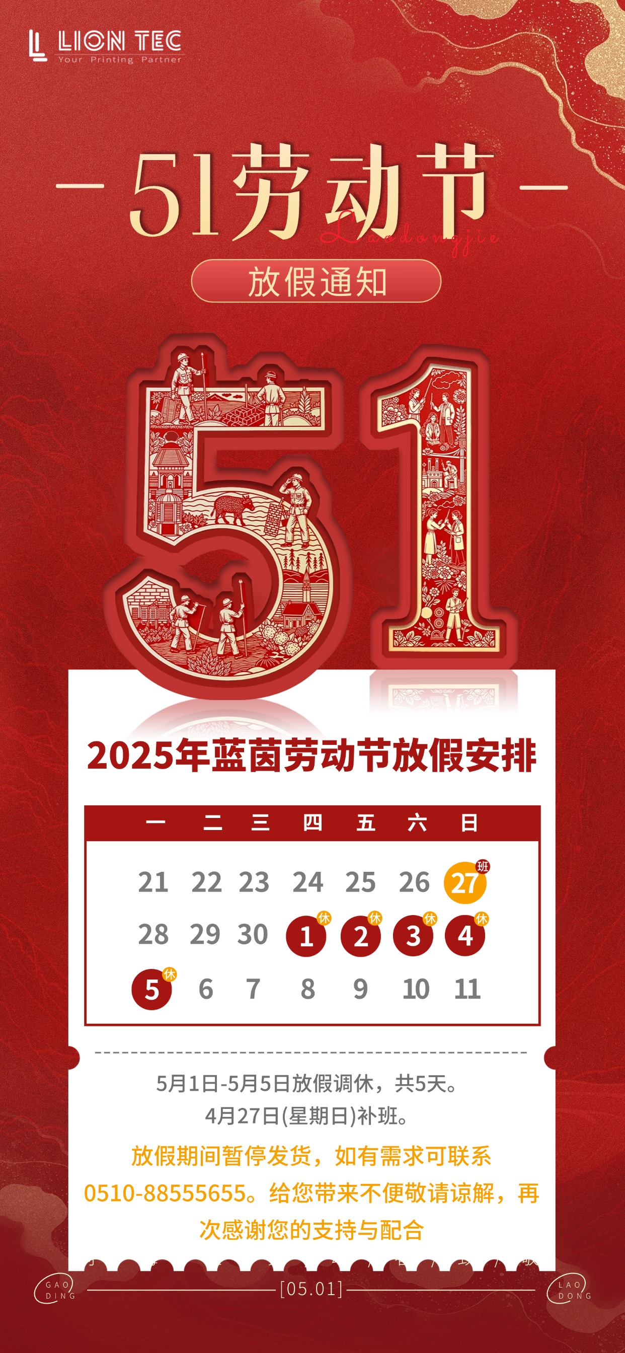 努力前行,不問歸期每一份勞動,都是點亮幸福的光致敬每一位努力奮斗的勞動者五一勞動節即將到來,根據國家法定節假日規定,噴碼機廠家-藍茵現將2025年勞動節放假安排通知如下: